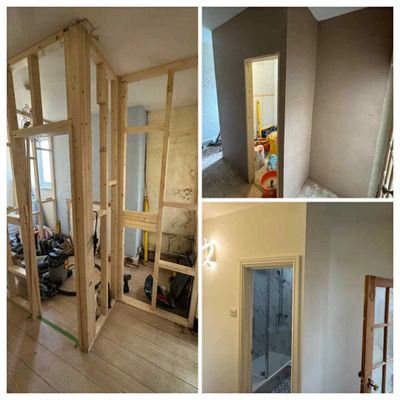 We constructed this room using 3" x 2" rimber with a 610mm doorway we installed 1000mm x 2400mm x 10mm shower panels around the full room for easy maintenance future, 1300mm x 800mm shower tray with 800mm glass wetroom screen and thermostatic shower with rain fall shower head.  Room was fully boarded inside and out, we carried out all plastering, electrical, carpentry and plumbing all in house with no sub contractors used.